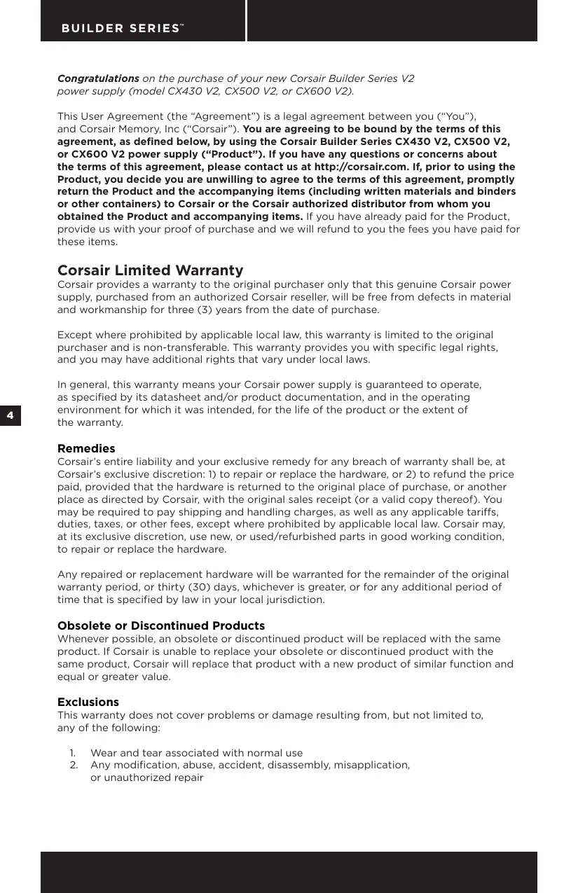 CX430V2 CX500V2 CX600V2 C X V 2 P O W E R S U P P LY B U I L D E R S E R I E S™ Congratulations on the purchase of your new Corsair Builder Series V2 power supply (model CX430 V2, CX500 V2, or CX600 V2). This User Agreement (the “Agreement”) is a legal agreement between you (“You”), and Corsair Memory, Inc (“Corsair”). You are agreeing to be bound by the terms of this agreement, as defined below, by using the Corsair Builder Series CX430 V2, CX500 V2, or CX600 V2 power supply (“Product”). If you have any questions or concerns about the terms of this agreement, please contact us at http://corsair.com. If, prior to using the Product, you decide you are unwilling to agree to the terms of this agreement, promptly return the Product and the accompanying items (including written materials and binders or other containers) to Corsair or the Corsair authorized distributor from whom you obtained the Product and accompanying items. If you have already paid for the Product, provide us with your proof of purchase and we will refund to you the fees you have paid for these items. Corsair Limited Warranty Corsair provides a warranty to the original purchaser only that this genuine Corsair power supply, purchased from an authorized Corsair reseller, will be free from defects in material and workmanship for three (3) years from the date of purchase. Except where prohibited by applicable local law, this warranty is limited to the original purchaser and is non-transferable. This warranty provides you with specific legal rights, and you may have additional rights that vary under local laws.