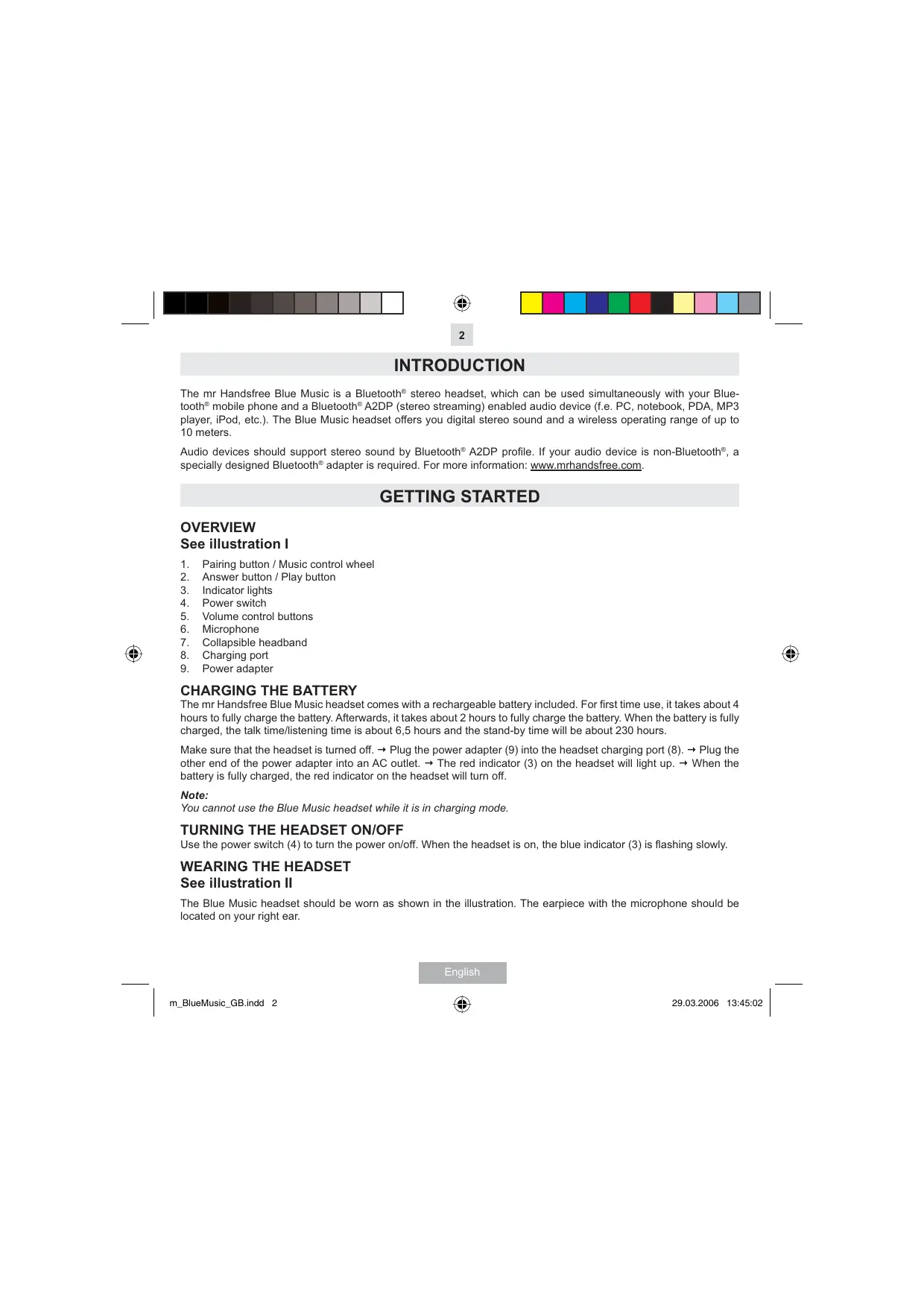 INTRODUCTION The mr Handsfree Blue Music is a Bluetooth® stereo headset, which can be used simultaneously with your Bluetooth® mobile phone and a Bluetooth® A2DP (stereo streaming) enabled audio device (f.e. PC, notebook, PDA, MP3 player, iPod, etc.). The Blue Music headset offers you digital stereo sound and a wireless operating range of up to 10 meters. Audio devices should support stereo sound by Bluetooth® A2DP profile. If your audio device is non-Bluetooth®, a specially designed Bluetooth® adapter is required. For more information: www.mrhandsfree.com. GETTING STARTED OVERVIEW See illustration I