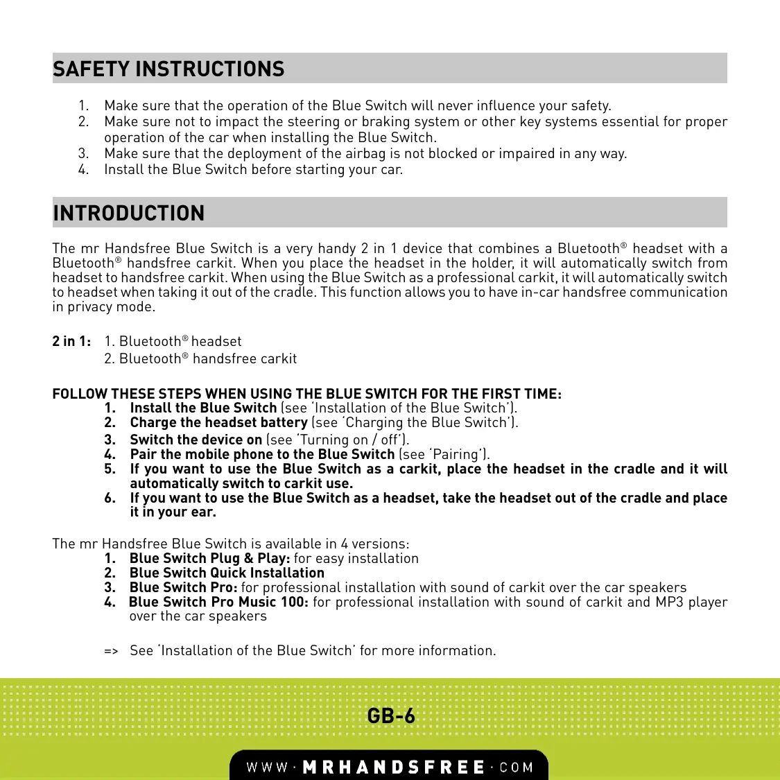 BLUE SWITCH - Bluetooth hands-free kit MR HANDSFREE - Free user manual and instructions