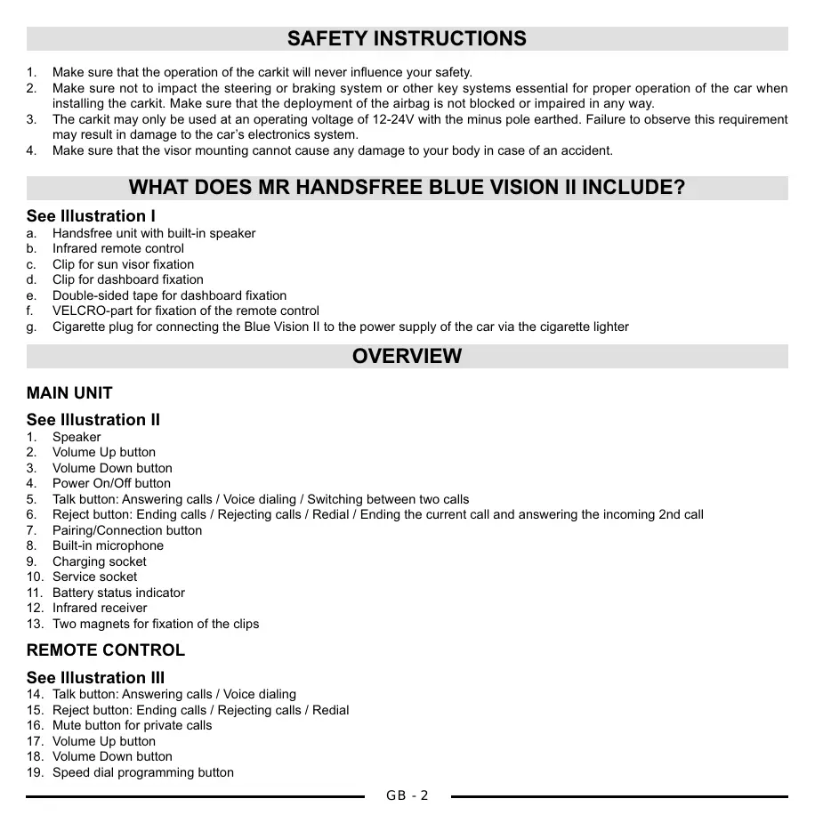 Illustration III Make sure that the operation of the carkit will never influence your safety. Make sure not to impact the steering or braking system or other key systems essential for proper operation of the car when installing the carkit. Make sure that the deployment of the airbag is not blocked or impaired in any way. The carkit may only be used at an operating voltage of 12-24V with the minus pole earthed. Failure to observe this requirement may result in damage to the car’s electronics system. Make sure that the visor mounting cannot cause any damage to your body in case of an accident. Handsfree unit with built-in speaker Infrared remote control Clip for sun visor fixation Clip for dashboard fixation Double-sided tape for dashboard fixation VELCRO-part for fixation of the remote control Cigarette plug for connecting the Blue Vision II to the power supply of the car via the cigarette lighter Speaker Volume Up button Volume Down button Power On/Off button Talk button: Answering calls / Voice dialing / Switching between two calls Reject button: Ending calls / Rejecting calls / Redial / Ending the current call and answering the incoming 2nd call Pairing/Connection button Built-in microphone Charging socket Service socket Battery status indicator Infrared receiver Two magnets for fixation of the clips Talk button: Answering calls / Voice dialing Reject button: Ending calls / Rejecting calls / Redial Mute button for private calls Volume Up button Volume Down button Speed dial programming button GB - 2