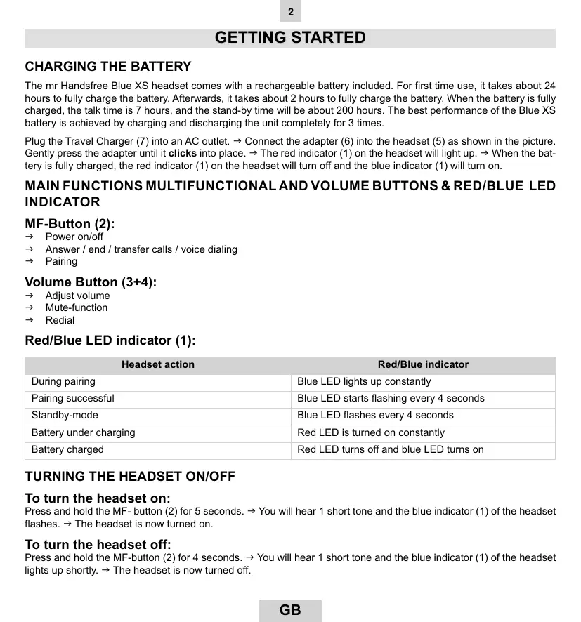 The Blue XS headset must be turned off before initiating pairing. Press and hold the MF-button (2) until the blue indicator (1) lights up constantly. The headset is now ready for pairing. Initiate the pairing process on your Bluetooth® mobile phone to pair with the Blue XS headset. (Refer to the manual of your mobile phone.) Select Blue XS out of the list with found devices on your mobile phone. You will be asked to enter the PIN-code to complete pairing, enter 0000 and confirm it. When the pairing has been successful, the blue indicator (1) of the headset will flash every 4 seconds.