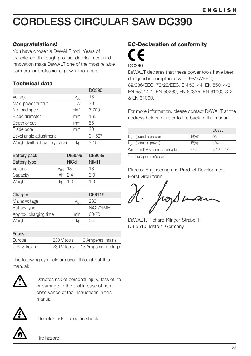 - at the operator’s ear Director Engineering and Product Development Horst Großmann DEWALT, Richard-Klinger-Straße 11 D-65510, Idstein, Germany 10 Amperes, mains 13 Amperes, in plugs The following symbols are used throughout this manual: Denotes risk of personal injury, loss of life or damage to the tool in case of nonobservance of the instructions in this manual. Denotes risk of electric shock. Fire hazard.