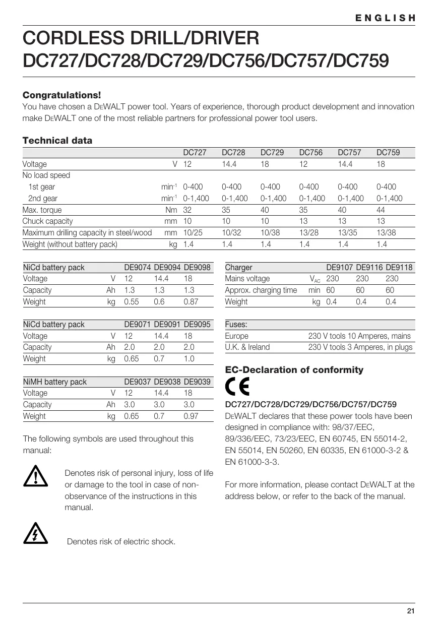 Download the instructions for your Cordless drill driver in PDF format for free! Find your manual DC759KA - DEWALT and take your electronic device back in hand. On this page are published all the documents necessary for the use of your device. DC759KA by DEWALT.