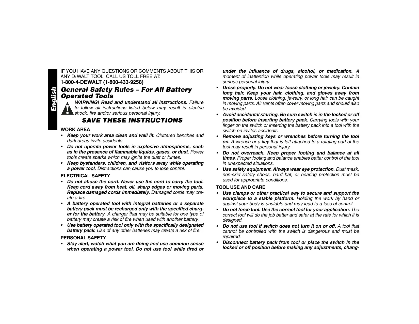 IF YOU HAVE ANY QUESTIONS OR COMMENTS ABOUT THIS OR ANY DEWALT TOOL, CALL US TOLL FREE AT: