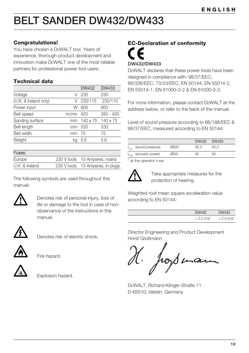 DEWALT declares that these power tools have been designed in compliance with: 98/37/EEC, 89/336/EEC, 73/23/EEC, EN 50144, EN 55014-2, EN 55014-1, EN 61000-3-2 & EN 61000-3-3. For more information, please contact DEWALT at the address below, or refer to the back of the manual. Level of sound pressure according to 86/188/EEC & 98/37/EEC, measured according to EN 50144: DW432