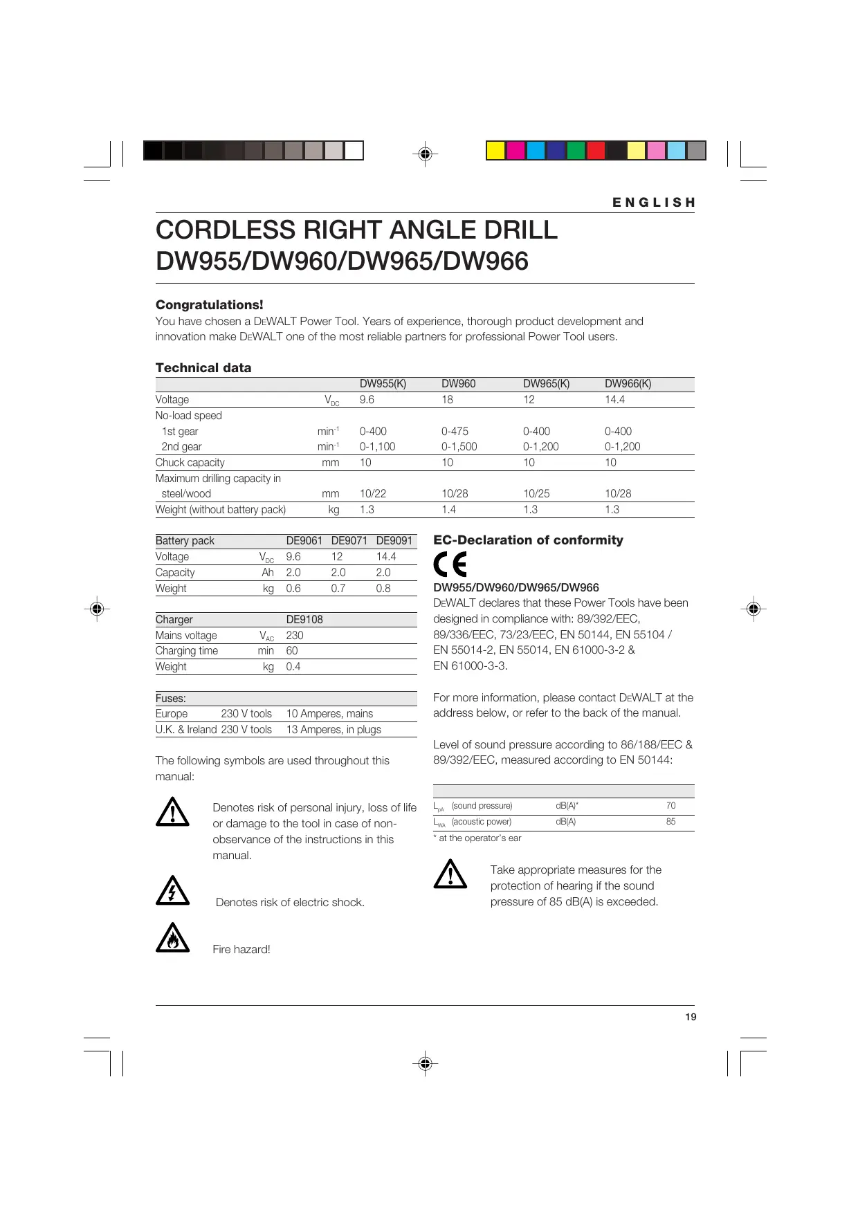 DW955/DW960/DW965/DW966 Congratulations! You have chosen a DEWALT Power Tool. Years of experience, thorough product development and innovation make DEWALT one of the most reliable partners for professional Power Tool users. Technical data Voltage No-load speed 1st gear 2nd gear Chuck capacity Maximum drilling capacity in steel/wood Weight (without battery pack) Battery pack Voltage Capacity Weight VDC