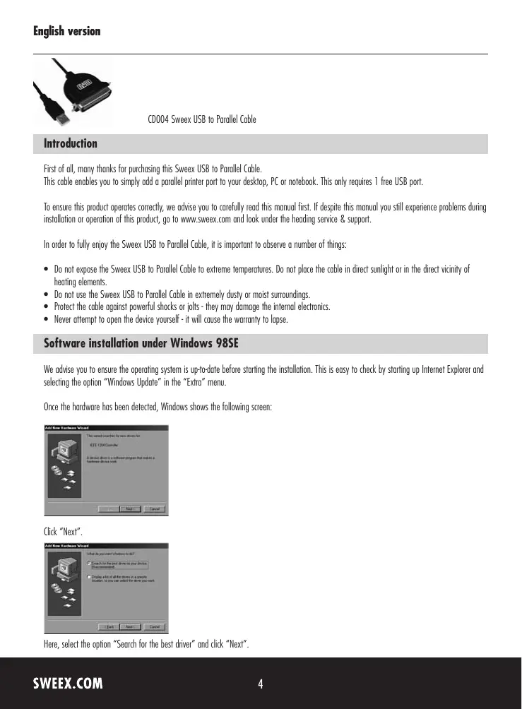 - Do not use the Sweex USB to Parallel Cable in extremely dusty or moist surroundings.