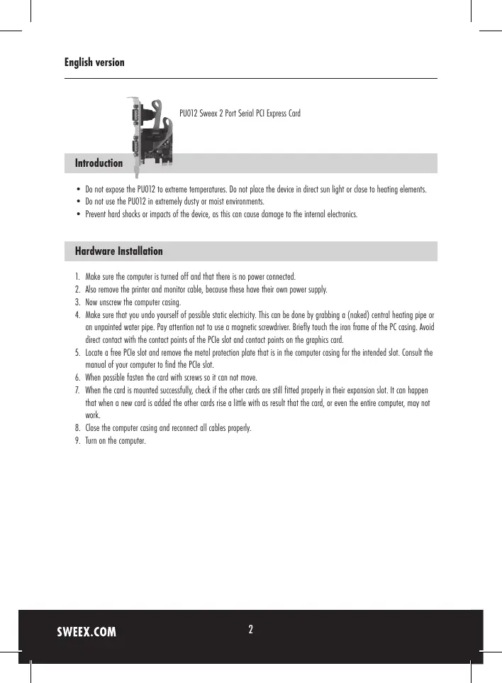 English version î PUO2 Se 2 Por Serial PCI Express Card Introduction + Do no eos he PUD t exrème tm. Dont pce he dei diet sun hr de t heu lement. + Do no use the PUDZ in xremel dust or most emionments + Print han hd or impas of he dei, sis an cause damage tea leon. Hardware Installation Ale sue campus um ff nd ht ae 0 one come. Also remove the printer and monitor cable, because these have their oun power supply. Aou unscrw the computer casing, Ale sut hat you amd ours of possible select. Ti cn be da by gb (naked central het pipe or en pci vo pipe, Pay non nt ue a mognñ sand, Biel touch he on ne of he PC ang od direct contact with the contoct points af he PCIe slot and contact points on the graphics car. ce a re Fe and remove he mel proton please computer cas fre intended at Corsa he amenual your comte nd he PU