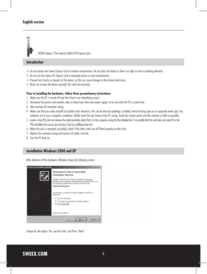 English version Fr PL200 See 1 Pt ml SATA 1 PO Bip Card Introduction Do not expose the Sueex Enres Crdt ete temperoturs. Do not place he device in Do nf use te Sneex POI Egress Cardin xremely duty or most environment. # Pret hard shoes ar impacs af he dei, as His cn aus domage the intel eleconcs. Rene ty open te dei yourself, his vid he war un gb ot se hein lemats. Por to instlling the hardware, follow these precautionary instructions: A sue the PCs umed of nd that tee iso newoking uen