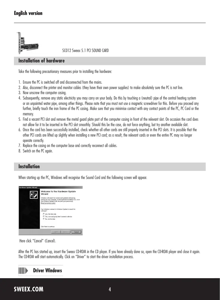 After the PC has started up, insert the Sweex CD-ROM in the CD player. If you have already done so, open the CD-ROM player and close it again. The CD-ROM will start automatically. Click on "Driver" to start the driver installation process.