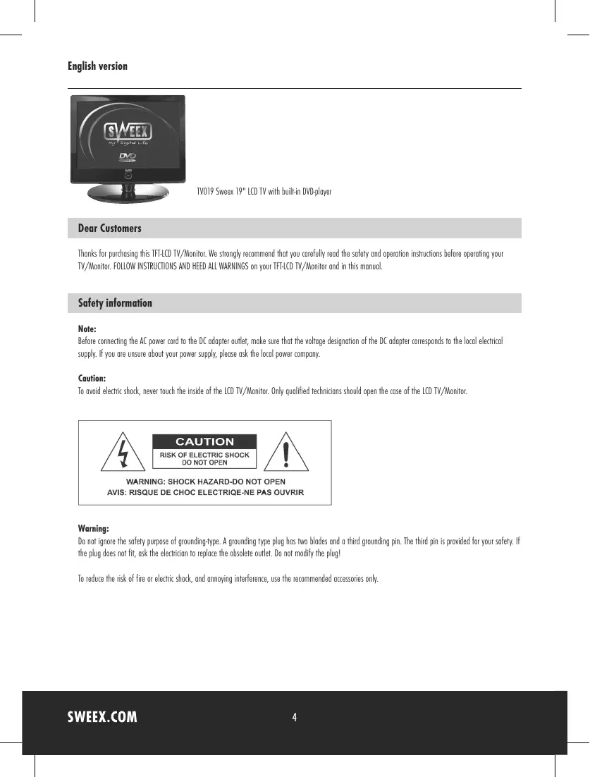 Download the instructions for your TV in PDF format for free! Find your manual TV019 - SWEEX and take your electronic device back in hand. On this page are published all the documents necessary for the use of your device. TV019 by SWEEX.