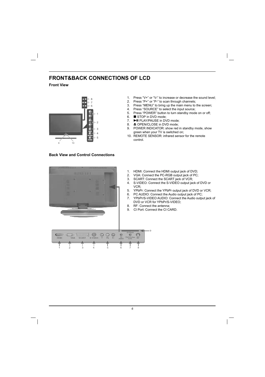 Press “V#" or “V." lo increase or decrease the sound level; Press “P+" or “P-" 10 scan through channels; Press “MENU Lo bring up the main menu to the screen; Press “SOURCE” to select the input source; Press POWER" button to turn standby mode on or off, M STOP in DVD mode; D-11 PLAY/PAUSE in DVD mode; Æ OPENICLOSE in DVD mode; POWER INDICATOR: show red in standby mode, show green when your TV is switched on: REMOTE SENSOR: infrared sensor for the remote control. HDMI: Connect ie HDMI output jack of DVD: VGA: Connect the PC-RGB output jack of PC: SCART: Connect the SCART jack of VCR: S-VIDEO: Connect the S-VIDEO output jack of DVD or VER: YPbPr: Connect the YPbPr output jack of DVD or VCR: PC AUDIO: Connect the Audio output jack of PC: YPbPr/S-VIDEO AUDIO: Connect Ihe Audio output jack of DVD or VCR for YPbPr/S-VIDEO; RF: Connect the antenna; CI Port: Connect the CI CARD.