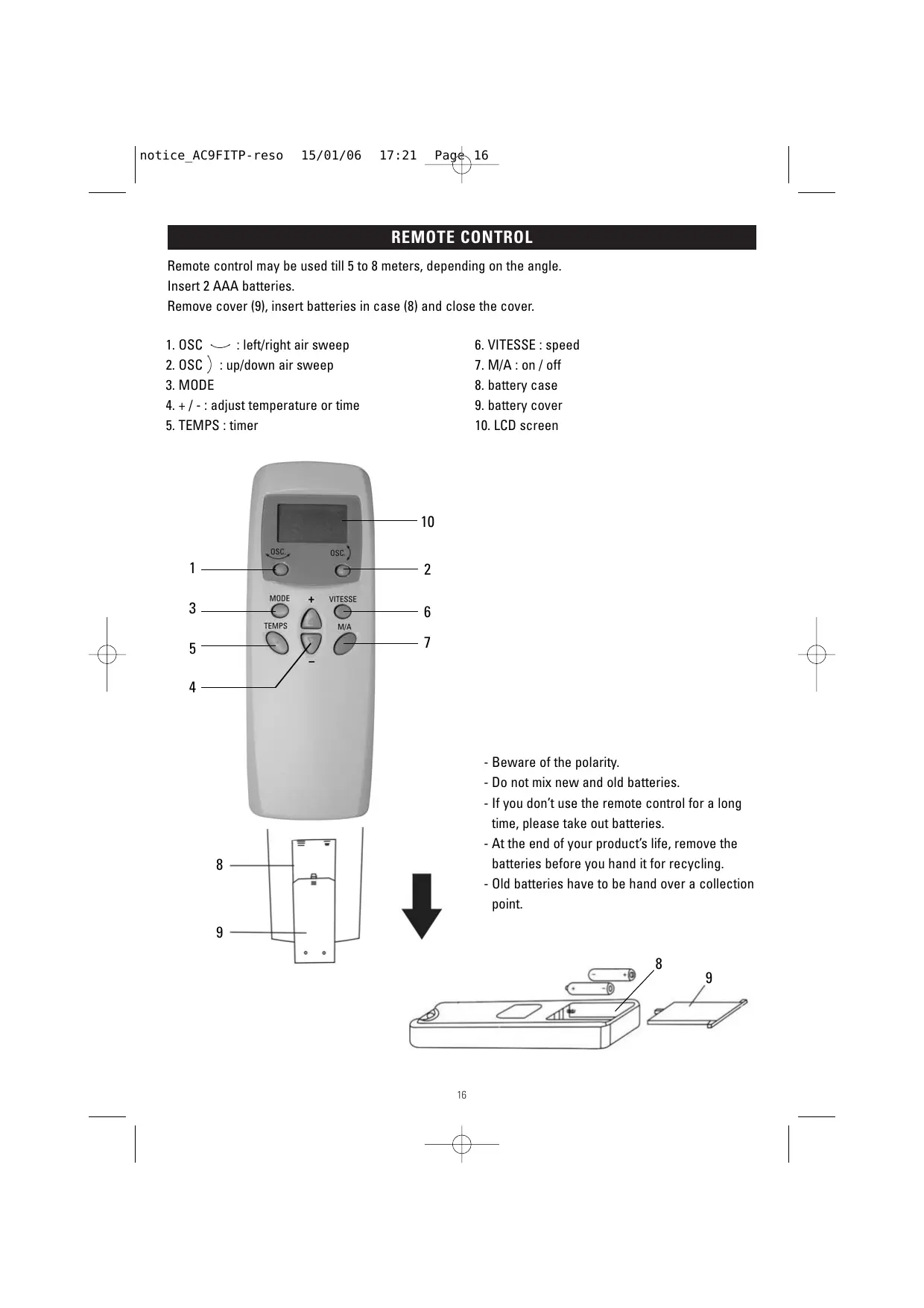 notice_AC9FITP-reso 15/01/06 17:21 Page 16 REMOTE CONTROL Remote control may be used till 5 to 8 meters, depending on the angle. Insert 2 AAA batteries. Remove cover (9), insert batteries in case (8) and close the cover.