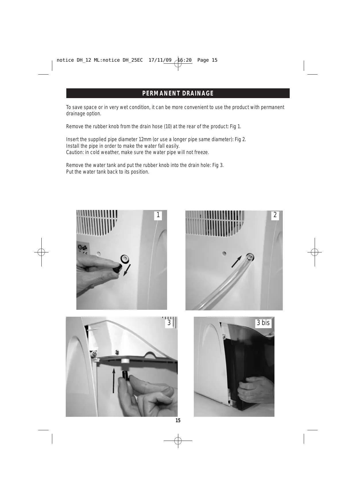 notice DH_12 ML:notice DH_25EC 17/11/09 16:20 Page 15 PERMANENT DRAINAGE To save space or in very wet condition, it can be more convenient to use the product with permanent drainage option. Remove the rubber knob from the drain hose (10) at the rear of the product: Fig 1. Insert the supplied pipe diameter 12mm (or use a longer pipe same diameter): Fig 2. Install the pipe in order to make the water fall easily. Caution: in cold weather, make sure the water pipe will not freeze. Remove the water tank and put the rubber knob into the drain hole: Fig 3. Put the water tank back to its position.