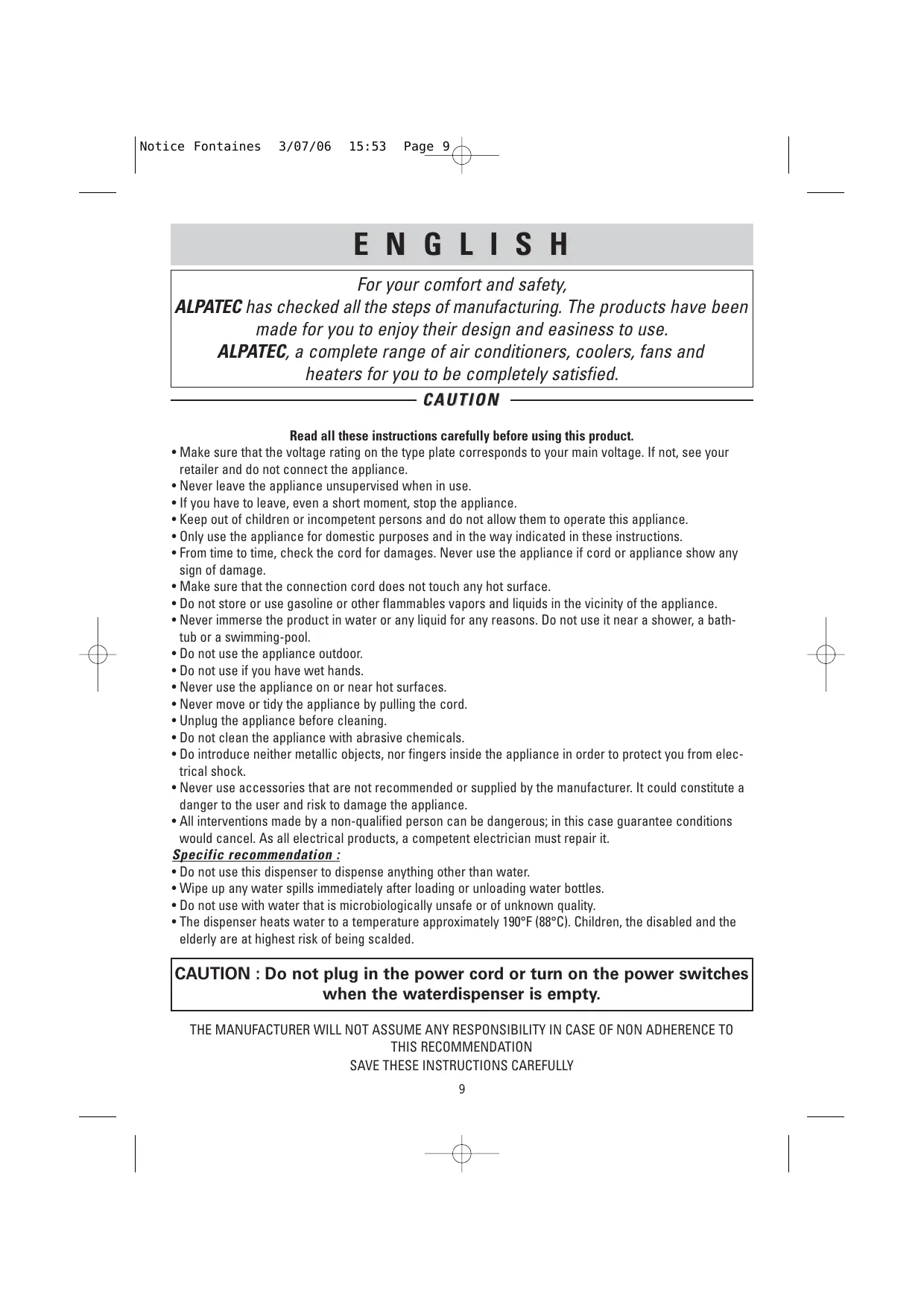 Notice Fontaines 3/07/06 15:53 Page 9 E N G L I S H For your comfort and safety, ALPATEC has checked all the steps of manufacturing. The products have been made for you to enjoy their design and easiness to use. ALPATEC, a complete range of air conditioners, coolers, fans and heaters for you to be completely satisfied. CAUTION Read all these instructions carefully before using this product.