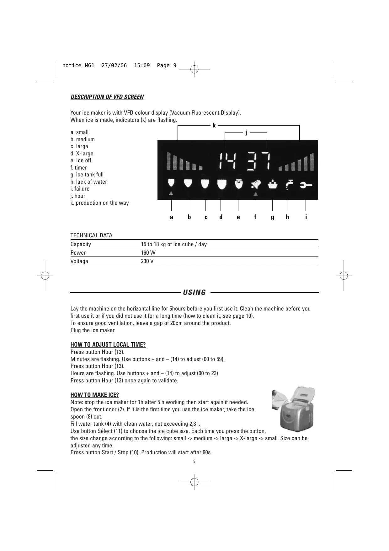 Note: Do not forget to select the ice size (this can be done any time). Timer can be cancel. Press button Timer (12). Timer indicator (f) is off