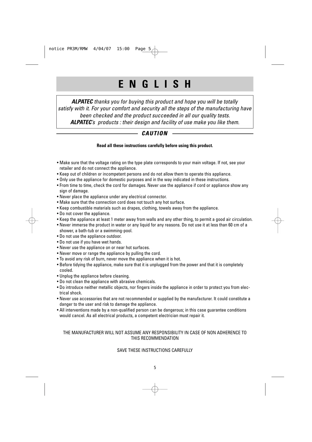 ENGLISH ALPATEC thanks you for buying this product and hope you will be totally satisfy with it. For your comfort and security all the steps of the manufacturing have been checked and the product succeeded in all our quality tests. ALPATECS products : their design and facility of use make you like them. CAUTION Read all these instructions carefully before using this product. + Make sure that the voltage rating on the type plate corresponds to your main voltage. If not, see your retailer and do not connect the appliance. + Keep out of children or incompetent persons and do not allow them to operate this appliance + Only use the appliance for domestic purposes and in the way indicated in these instructions. + From time to time, check the cord for damages. Never use the appliance if cord or appliance show any sign of damage. + Never place the appliance under any electrical connector. + Make sure that the connection cord does not touch any hot surface. + Keep combustible materials such as drapes, clothing, towels away from the appliance. + Do not cover the appliance. + Keep the appliance at least 1 meter away from walls and any other thing, to permit a good air circulation. + Never immerse the product in water or any liquid for any reasons. Do not use it at less than 60 cm of a shower, a bath-tub or a swimming-pool. + Do not use the appliance outdoor. + Do not use if you have wet hands. + Never use the appliance on or near hot surfaces. + Never move or range the appliance by pulling the cord. + To avoid any risk of burn, never move the appliance when it is hot. < Before tidying the appliance, make sure that it is unplugged from the power and that it is completely cooled. + Unplug the appliance before cleaning. + Do not clean the appliance with abrasive chemicals. + Do introduce neither metallic objects, nor fingers inside the appliance in order to protect you from elec- trical shock. + Never use accessories that are not recommended or supplied by the manufacturer. It could constitute a danger to the user and risk to damage the appliance. + All interventions made by a non-qualified person can be dangerous; in this case guarantee conditions would cancel. As all electrical products, a competent electrician must repair it. THE MANUFACTURER WILL NOT ASSUME ANY RESPONSIBILITY IN CASE OF NON ADHERENCE TO THIS RECOMMENDATION