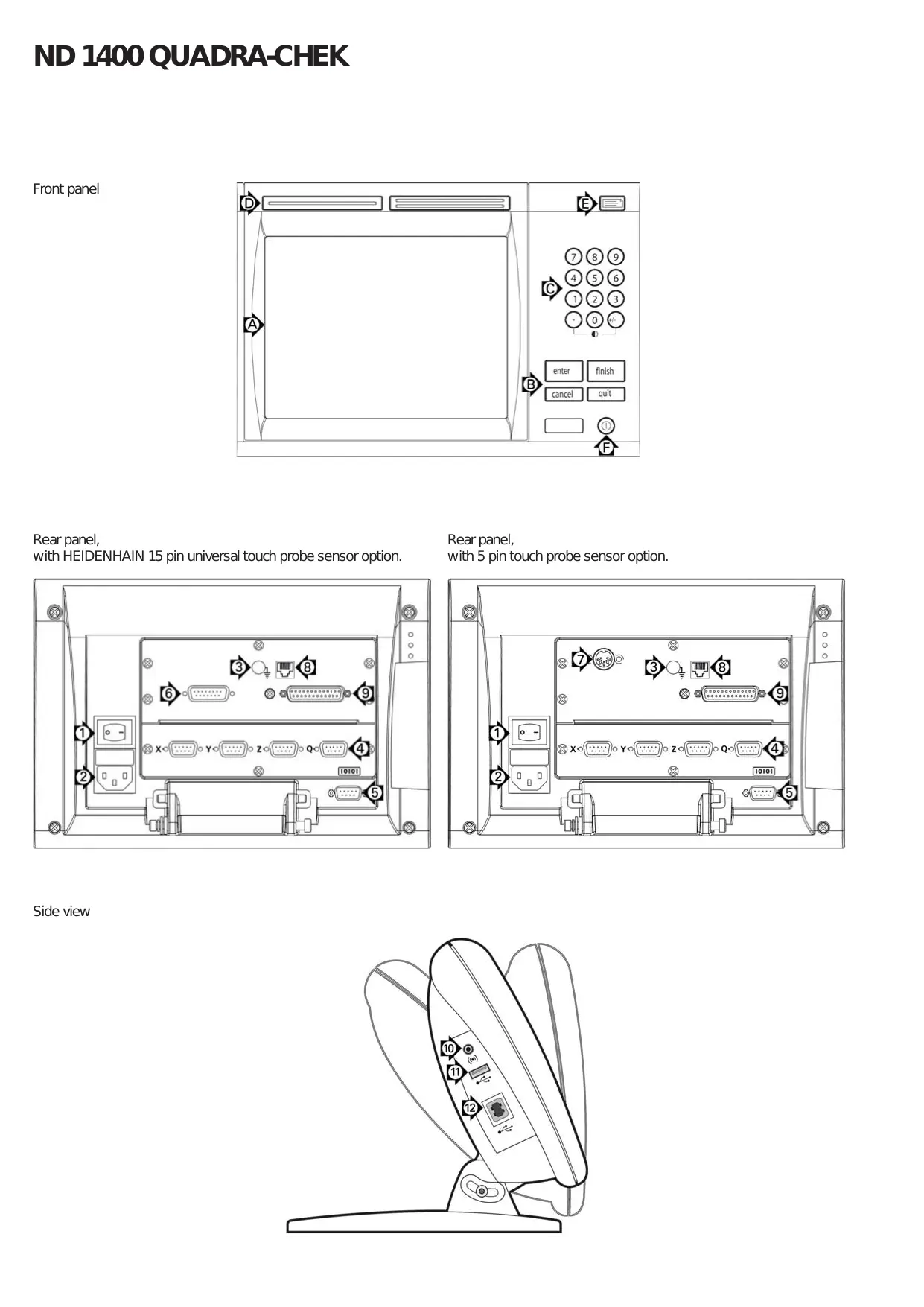 Power switch Power connection with fuse Ground (protective ground) Encoder inputs, X, Y, Z axis for linear encoders Q axis for rotary encoder. Interface specified at the time of purchase. RS-232-C interface for PC connection. RS-232 cable must not include crossovers. Probe connector for HEIDENHAIN 15 pin universal touch probe sensor. Probe connector for 5-pin touch probe sensor. Remote accessory interface RJ-45 for optional foot switch accessory. Unused Connections side view Caution Do not connect encoders or other equipment to the ND 1400 when the power is on. Safety Considerations General accepted safety precautions must be followed when operating the ND 1400. Failure to observe these precautions could result in damage to the equipment, or injury to personnel. It is understood that safety rules within individual companies vary. If a conflict exists between the material contained in this guide and the rules of a company using this system, the more stringent rules should take precedence.