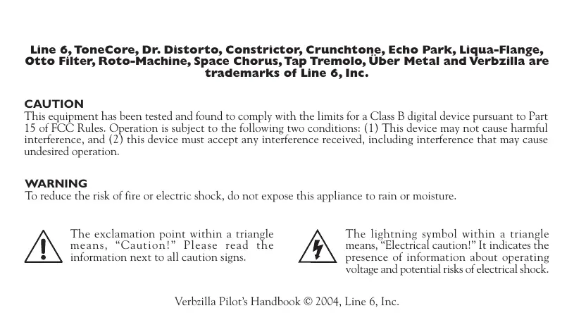 Pilot’s Handbook for Verbzilla Pilotenhandbuch für Verbzilla Manuel de pilotage pour Verbzilla Pilotenhandboek voor Verbzilla Patent Pending 40-00-0223 Electrophonic Limited Edition available @ www.line6.com Rev C Line 6, ToneCore, Dr. Distorto, Constrictor, Crunchtone, Echo Park, Liqua-Flange, Otto Filter, Roto-Machine, Space Chorus, Tap Tremolo, Über Metal and Verbzilla are trademarks of Line 6, Inc. CAUTION This equipment has been tested and found to comply with the limits for a Class B digital device pursuant to Part 15 of FCC Rules. Operation is subject to the following two conditions: (1) This device may not cause harmful interference, and (2) this device must accept any interference received, including interference that may cause undesired operation. WARNING To reduce the risk of fire or electric shock, do not expose this appliance to rain or moisture. The exclamation point within a triangle means, “Caution!” Please read the information next to all caution signs. The lightning symbol within a triangle means, “Electrical caution!” It indicates the presence of information about operating voltage and potential risks of electrical shock. Verbzilla Pilot’s Handbook © 2004, Line 6, Inc. You should read these Important Safety Instructions. Keep these instructions in a safe place. Before using your ToneCore, carefully read the applicable items of these operating instructions and the safety suggestions.