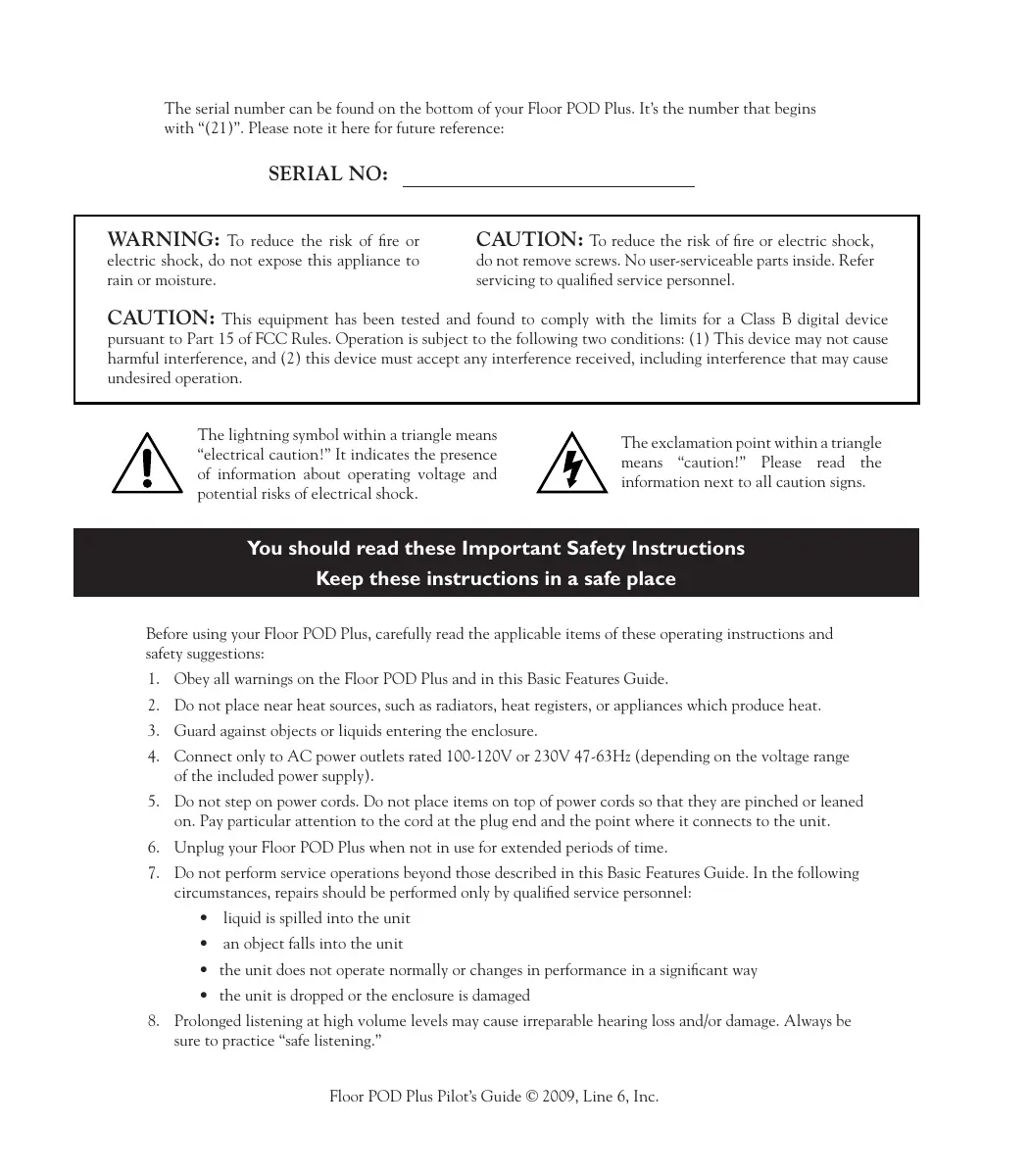 electric shock, do not expose this appliance to do not remove screws. No user-serviceable parts inside. Refer rain or moisture. servicing to qualified service personnel. CAUTION: This equipment has been tested and found to comply with the limits for a Class B digital device pursuant to Part 15 of FCC Rules. Operation is subject to the following two conditions: (1) This device may not cause harmful interference, and (2) this device must accept any interference received, including interference that may cause undesired operation The lightning symbol within a triangle means The exclamation point within a triangle means “caution!” Please read the “electrical caution!” It indicates the presence of information about operating voltage and information next 10 al caution signs potential risks of electrical shock. You should read these Important Safety Instructions Keep these instructions in a safe place Before using your Floor POD Plus, carefully read the applicable items of these operating instructions and safety suggestions: