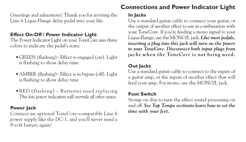 Grectings and salutations! Thank you for inviting the Line 6 Liqua-Flange delay pedal into your life. Effect On-Off/ Power Indicator Light The Power Indicator Light on your ToneCore uses three colors to indicate the pedal's state: + GREEN (flashing)- Effect is engaged (on). Light is flashing to show delay time + AMBER (flashing)- Effect is in bypass (off). Light is flashing to show delay time *RED (flashing) - Batteries need replacing This low power indication will override all other states. Power Jack Connect an optional ToneCore-compatible Line 6 power supply like the DC-1, and you'll never need a 9-volt battery again! Connections and Power Indicator Light In Jacks Use a standard guitar cable to connect your guitar, or the output of another effect ro use in combination with your ToneCore. If you're fceding a mono signal to your Liqua-Flange, use the MONO/L jack. Like most pedals, inserting a plug into this jack will turn on the power to your ToneCore. Disconnect both input plugs from jacks when the ToneCore is not being used. Out Jacks Use a standard guitar cable to connect to the inputs of a guitar amp, or the inputs of another effect that will fecd your amp. For mono, use the MONOLL jack Foot Switch Stomp on this to turn the effect sound processing on and off. See Tap Tempo sectionto learn how to set the time with your feet.
