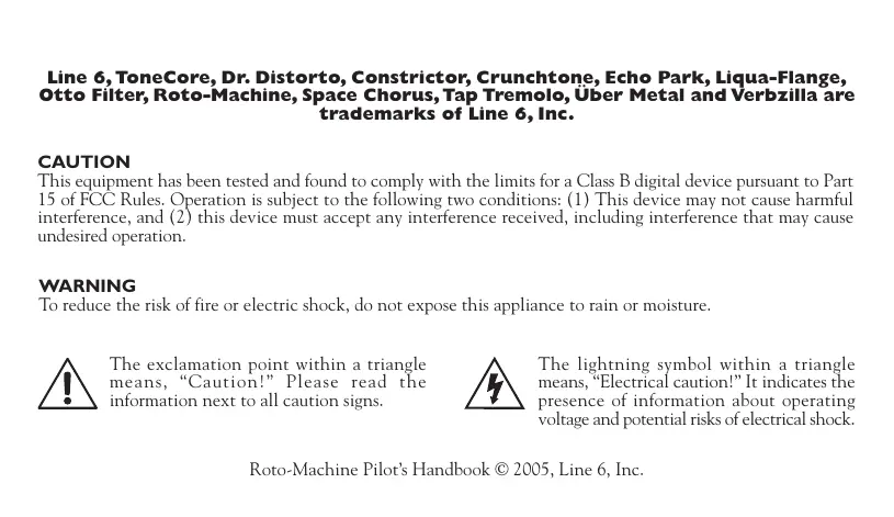 Line 6, ToneCore, Dr. Distorto, Constrictor, Crunchtone, Echo Park, Liqua-Flange, otto Filter, Roto-Machine, Space Chorus, Tap Tremolo, Über Metal and Verbzilla are trademarks of Line 6, Inc. CAUTION This equipment has been tested and found to comply with the limits for a Class B digital device pursuant to Part 15 of FCC Rules. Operation is subject to the following nwo conditions: (1) This device may not cause harmful interference, and (2) this device must accept any interference received, including iterference that maÿ cause undesired operation. WARNING To reduce the risk of fire or electric shock, do not expose this appliance to rain or moisture. The exclamation point within a triangle The lightning symbol within a triangle A means, “Caution!” Please read the means, “Electrical caution!” It indicates the information next to all caution signs presence of information about operating voltage and potential risks ofelectrical shock Roto-Machine Pilots Handbook © 2005, Line 6, Inc.