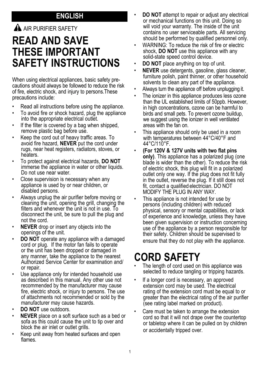 À AR PURIFIER SAFETY READ AND SAVE THESE IMPORTANT SAFETY INSTRUCTIONS When using electrical appliances, basic safety pre- cautions should always be followed to reduce the risk of fire, electric shock, and injury to persons.These precautions include: