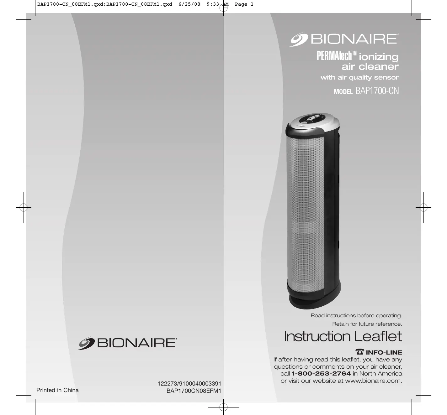 questions or comments on your air cleaner, call 1-800-253-2764 in North America or visit our website at www.bionaire.com.