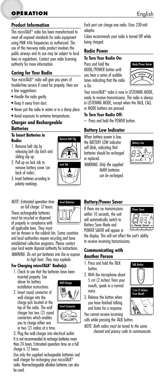Use only the supplied rechargeable batteries and wall charger for recharging your microTALK radio. Non-rechargeable alkaline batteries can also be used.