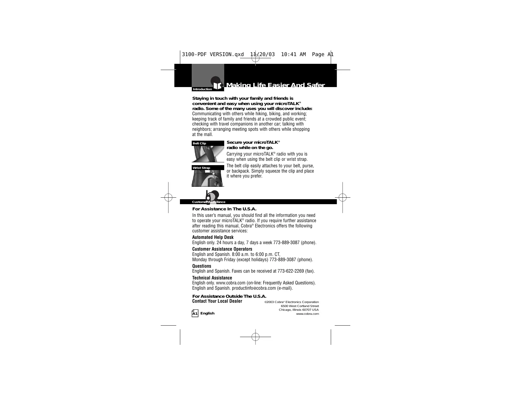 In this user's manual, you should find all the information you need to operate your microTALK® radio. If you require further assistance after reading this manual, Cobra Electronics offers the following customer assistance services: