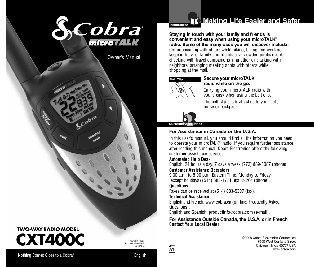 CustomePggtance For Assistance in Canada or the U.S.A. In this users manual, you should find all the information you need to operate your microTALK® radio. If you require further assistance after reading this manual, Cobra Electronics offers the following customer assistance services: Automated Help Desk English. 24 hours a day, 7 days a week (773) 889-3087 (phone) Customer Assistance Operators 2:00 a.m. to 5:00 p.m. Eastern Time, Monday to Friday {except holidays) (514) 683-1771, ext. 2-264 (phone) Questions Faxes can be received at (514) 683-5307 (fax). Technical Assistance English and French. www.cobra.ca (on-line: Frequently Asked Questions) English and Spanish. productinfoæcobra.com (e-mail) For Assistance Outside Canada, the U.S.A. or in French Contact Your Local Dealer 22008 Cobra Electronics Corporation 6500 West Corlland Seat