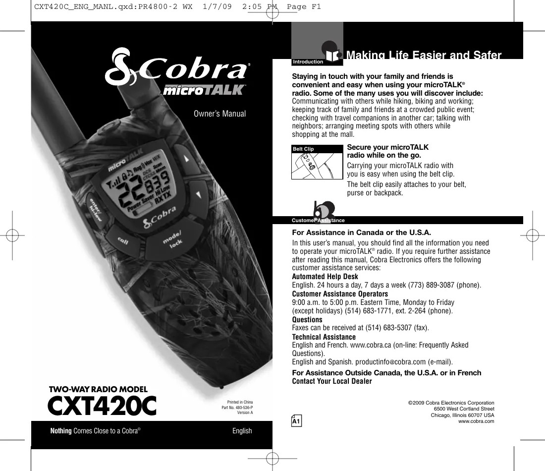 à É op" Q CustomePAgftance For Assistance in Canada or the U.S.A. In this user's manual, you should find all the information you need to operate your microTALK® radio. If you require further assistance after reading this manual, Cobra Electronics offers the following customer assistance services: Automated Help Desk English. 24 hours à day, 7 days a week (773) 889-3087 (phone). Customer Assistance Operators 9:00 a.m. to 5:00 p.m. Eastern Time, Monday to Friday {except holidays) (514) 683-1771, ext. 2-264 (phone). Questions Faxes can be received at (514) 683-5307 (fax). Technical Assistance English and French. www.cobra.ca (on-line: Frequently Asked Questions). English and Spanish. productinfoæcobra.com (e-mail). For Assistance Outside Canada, the U.S.A. or in French Contact Your Local Dealer
