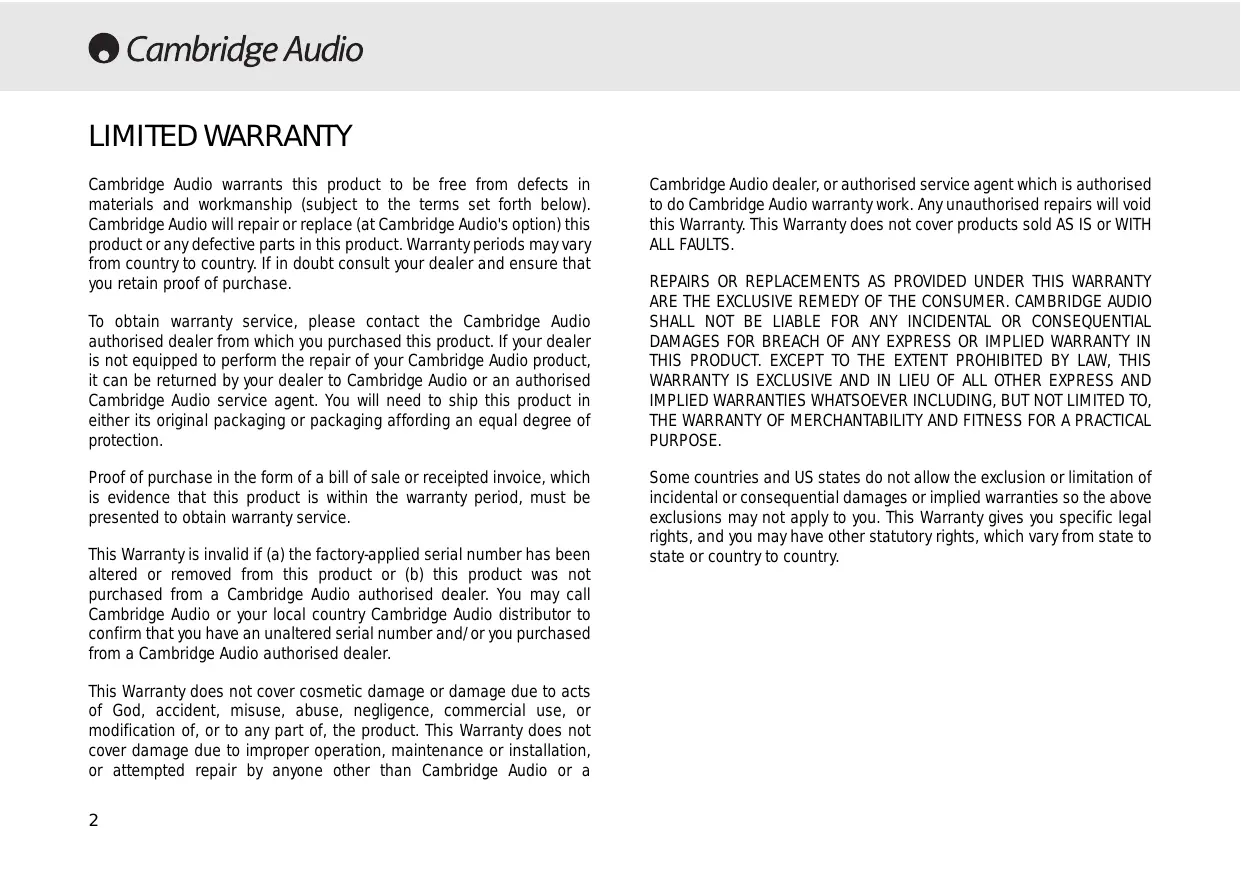 LIMITED WARRANTY Cambridge Audio warrants this product to be free from defects in materials and workmanship (subject to the terms set forth below). Cambridge Audio will repair or replace (at Cambridge Audio's option) this product or any defective parts in this product. Warranty periods may vary from country to country. If in doubt consult your dealer and ensure that you retain proof of purchase. To obtain warranty service, please contact the Cambridge Audio authorised dealer from which you purchased this product. If your dealer is not equipped to perform the repair of your Cambridge Audio product, it can be returned by your dealer to Cambridge Audio or an authorised Cambridge Audio service agent. You will need to ship this product in either its original packaging or packaging affording an equal degree of protection. Proof of purchase in the form of a bill of sale or receipted invoice, which is evidence that this product is within the warranty period, must be presented to obtain warranty service. This Warranty is invalid if (a) the factory-applied serial number has been altered or removed from this product or (b) this product was not purchased from a Cambridge Audio authorised dealer. You may call Cambridge Audio or your local country Cambridge Audio distributor to confirm that you have an unaltered serial number and/or you purchased from a Cambridge Audio authorised dealer. This Warranty does not cover cosmetic damage or damage due to acts of God, accident, misuse, abuse, negligence, commercial use, or modification of, or to any part of, the product. This Warranty does not cover damage due to improper operation, maintenance or installation, or attempted repair by anyone other than Cambridge Audio or a 2