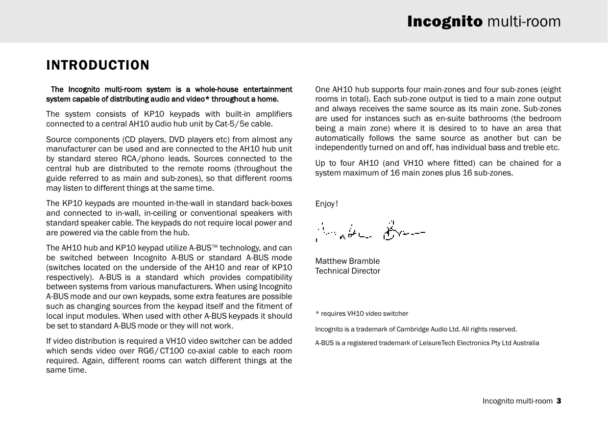 INTRODUCTION The Incognito multi-room system is a whole-house entertainment system capable of distributing audio and video* throughout a home. The system consists of KP10 keypads with builtin amplifiers connected to a central AH10 audio hub unit by Cat-5/5e cable. Source components (CD players, DVD players etc) from almost any manufacturer can be used and are connected to the AH10 hub unit by standard stereo RCA/phono leads. Sources connected to the central hub are distributed to the remote rooms (throughout the guide referred to as main and sub-zones), so that different rooms may listen to different things at the same time. The KP10 keypads are mounted in-the-wall in standard back-boxes and connected to in-wall, in-ceiling or conventional speakers with standard speaker cable. The keypads do not require local power and are powered via the cable from the hub. The AH10 hub and KP10 keypad utilize A-BUS” technology, and can be switched between Incognito A-BUS or standard A-BUS mode {switches located on the underside of the AH10 and rear of KP10 respectively). A-BUS is a standard which provides compatibility between systems from various manufacturers. When using Incognito ABUS mode and our own keypads, some extra features are possible such as changing sources from the keypad itself and the fitment of local input modules. When used with other A-BUS keypads it should be set to standard A-BUS mode or they will not work. If video distribution is required a VH10 video switcher can be added which sends video over RG6/CT100 co-axial cable to each room required. Again, different rooms can watch different things at the same time. Incognito multi-room One AH10 hub supports four main-zones and four sub-zones (eight rooms in total). Each sub-zone output is tied to a main zone output and always receives the same source as its main zone. Sub-zones are used for instances such as en-suite bathrooms (the bedroom being à main zone) where it is desired to to have an area that automatically follows the same source as another but can be independentiy turned on and off, has individual bass and treble etc. Up to four AH10 (and VH10 where fited) can be chained for a system maximum of 16 main zones plus 16 sub-zones. Enjoy! . ni “n Be. ve Matthew Bramble Technical Director