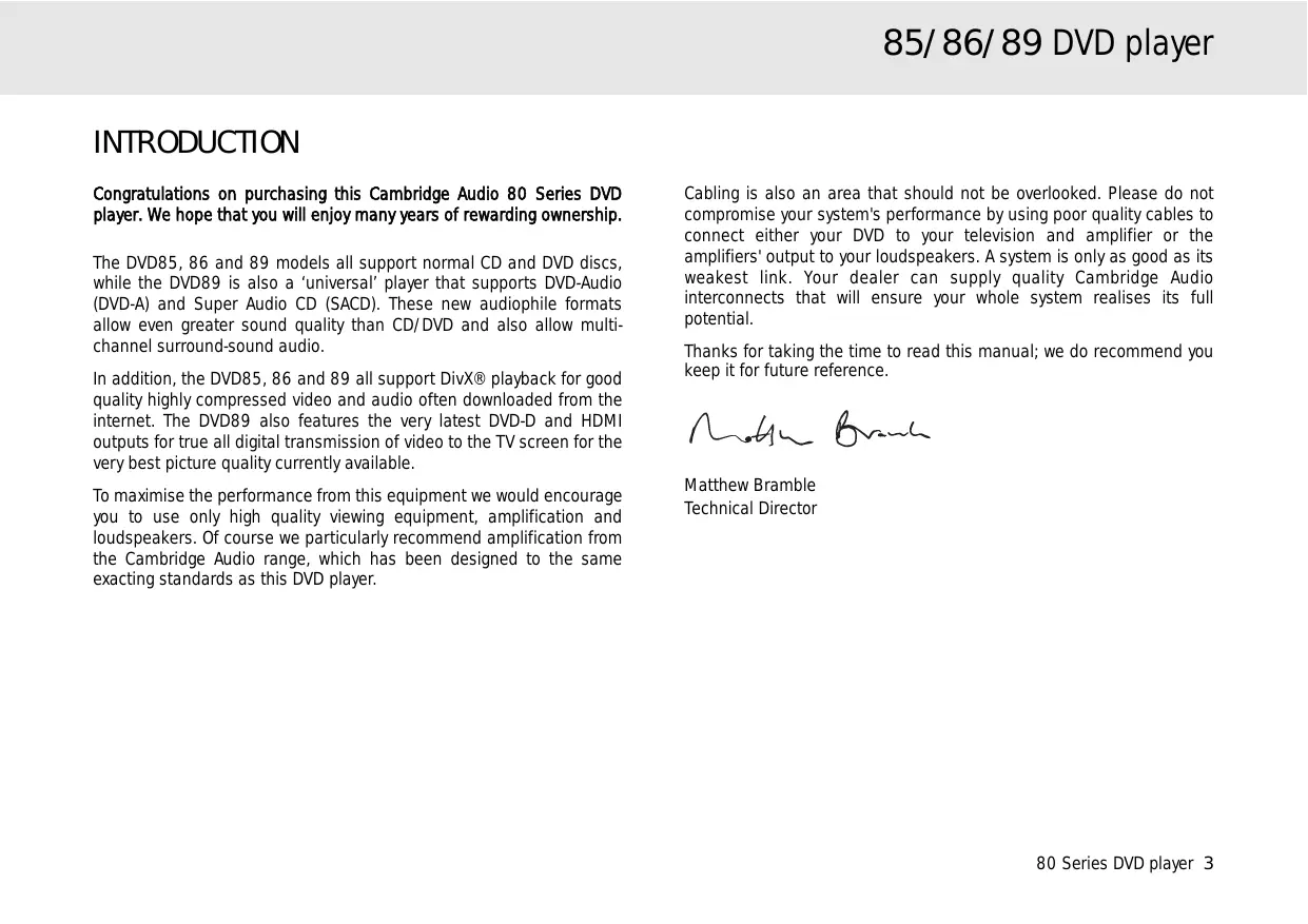 INTRODUCTION Congratulations on purchasing this Cambridge Audio 80 Series DVD player. We hope that you will enjoy many years of rewarding ownership. The DVD85, 86 and 89 models all support normal CD and DVD discs, while the DVD89 is also a ‘universal’ player that supports DVD-Audio (DVD-A) and Super Audio CD (SACD). These new audiophile formats allow even greater sound quality than CD/DVD and also allow multichannel surround-sound audio. In addition, the DVD85, 86 and 89 all support DivX® playback for good quality highly compressed video and audio often downloaded from the internet. The DVD89 also features the very latest DVD-D and HDMI outputs for true all digital transmission of video to the TV screen for the very best picture quality currently available. To maximise the performance from this equipment we would encourage you to use only high quality viewing equipment, amplification and loudspeakers. Of course we particularly recommend amplification from the Cambridge Audio range, which has been designed to the same exacting standards as this DVD player.