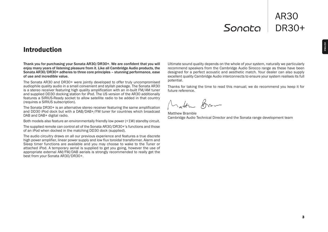 Thank you for purchasing your Sonata AR30/DR30+. We are confident that you will enjoy many years of listening pleasure from it. Like all Cambridge Audio products, the Sonata AR30/DR30+ adheres to three core principles - stunning performance, ease of use and incredible value.