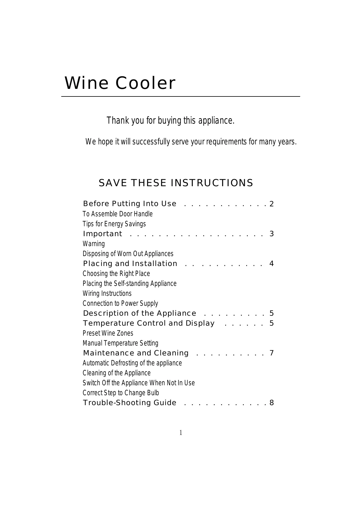 Wine Cooler Thank you for buying this appliance. We hope it will successfully serve your requirements for many years.
