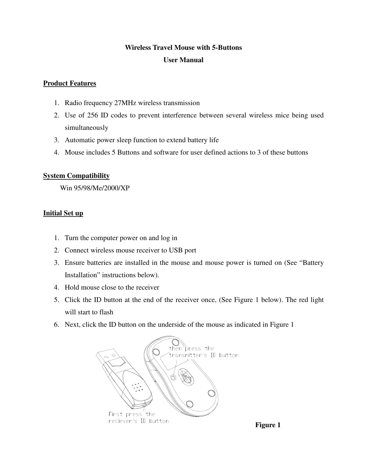 Wireless Travel Mouse with 5-Buttons User Manual Product Features Radio frequency 27MHz wireless transmission Use of 256 ID codes to prevent interference between several wireless mice being used simultaneously Automatic power sleep function to extend battery life Mouse includes 5 Buttons and software for user defined actions to 3 of these buttons System Compatibility Win 95/98/Me/2000/XP Initial Set up . Turn the computer power on and log in Connect wireless mouse receiver to USB port Ensure batteries are installed in the mouse and mouse power is turned on (See “Battery Installation” instructions below). Hold mouse close to the receiver Click the ID button at the end of the receiver once, (See Figure 1 below). The red light will start to flash Next, click the ID button on the underside of the mouse as indicated in Figure 1 Figure 1