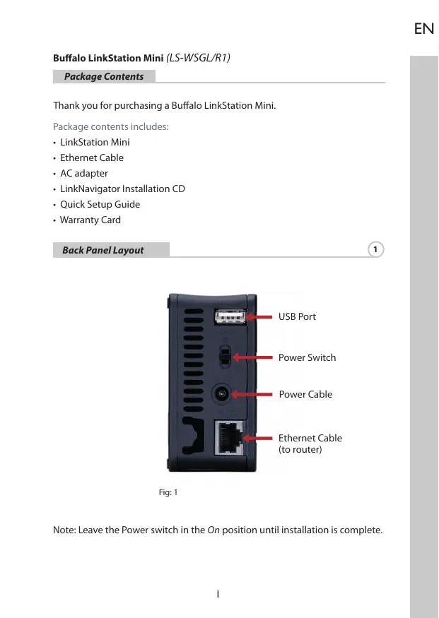 EN Buffalo LinkStation Mini (LS-WSGL/R1) Package Contents Thank you for purchasing a Buffalo LinkStation Mini. Package contents includes: • LinkStation Mini • Ethernet Cable • AC adapter • LinkNavigator Installation CD • Quick Setup Guide • Warranty Card Back Panel Layout