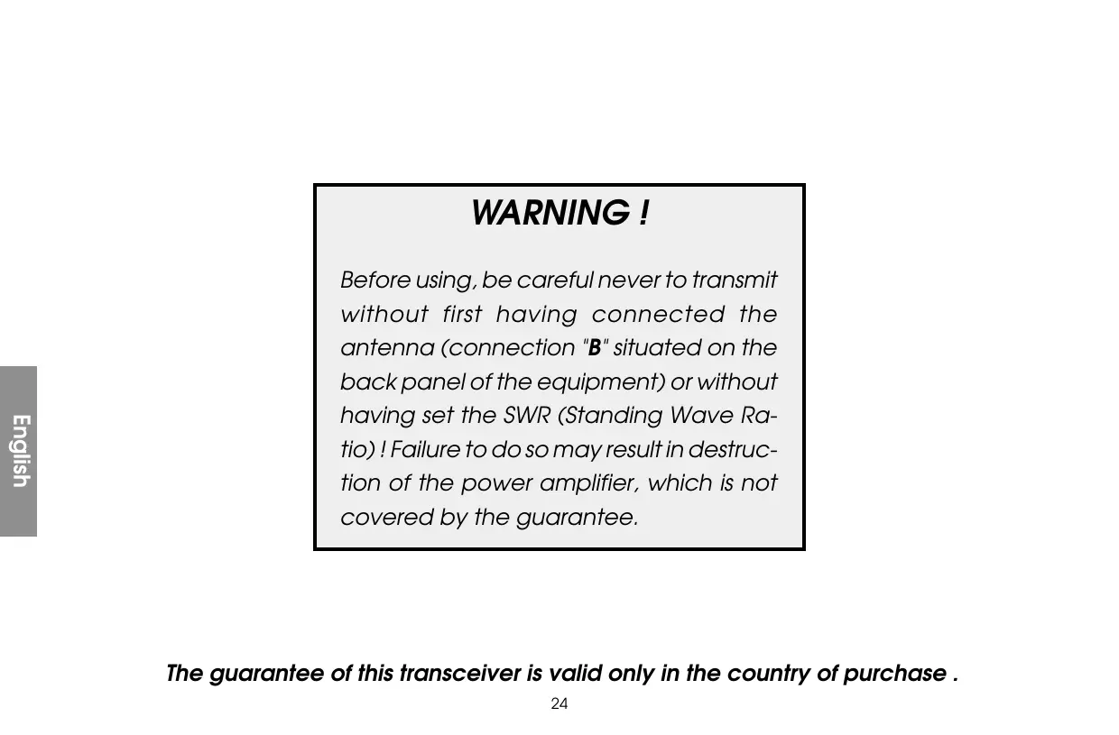 Papa Quebec Romeo Sierra Tango Uniform Victor Before using, be careful never to transmit without first having connected the antenna (connection "B" situated on the back panel of the equipment) or without having set the SWR (Standing Wave Ratio) ! Failure to do so may result in destruction of the power amplifier, which is not covered by the guarantee. The guarantee of this transceiver is valid only in the country of purchase .