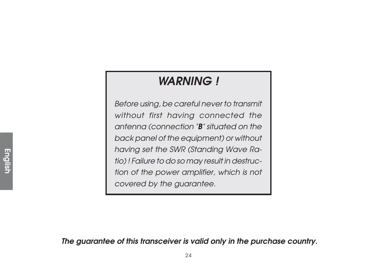 WARNING ! English Before using, be careful never to transmit without first having connected the antenna (connection "B" situated on the back panel of the equipment) or without having set the SWR (Standing Wave Ratio) ! Failure to do so may result in destruction of the power amplifier, which is not covered by the guarantee. The guarantee of this transceiver is valid only in the purchase country.