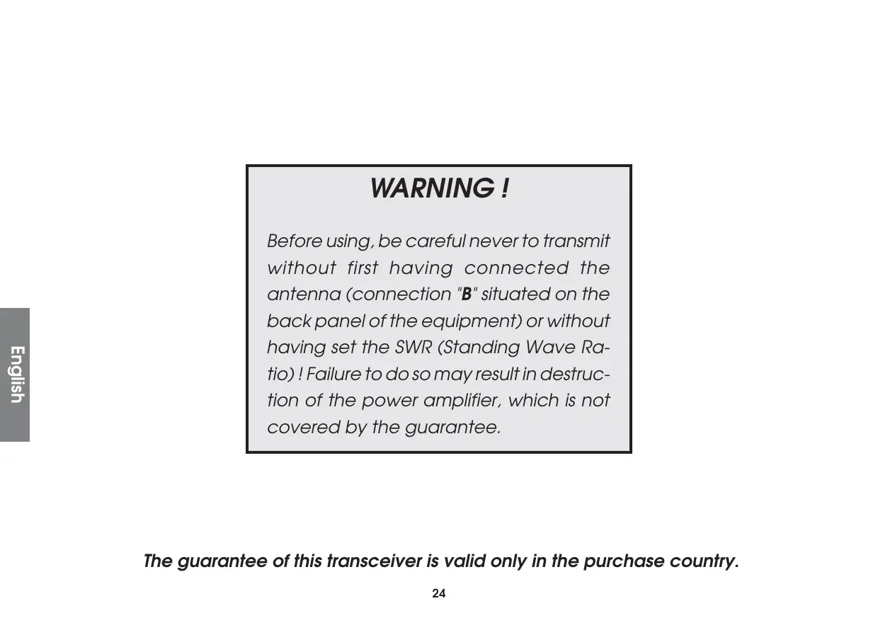 WARNING ! English Before using, be careful never to transmit without first having connected the antenna (connection "B" situated on the back panel of the equipment) or without having set the SWR (Standing Wave Ratio) ! Failure to do so may result in destruction of the power amplifier, which is not covered by the guarantee. The guarantee of this transceiver is valid only in the purchase country.