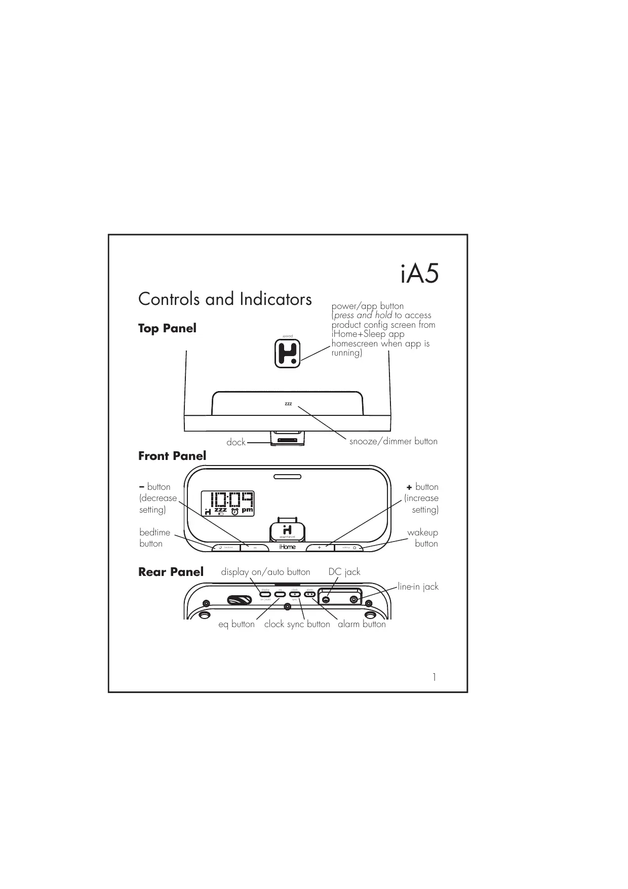 Display AS Note: Display and indicators depend on mode. The iAS is specially designed to work with the iHome+Sleep alarm clock app. For optimized compatibility, by default the iA5's display will auto- matically deactivate and defer to a docked iPhone or iPod touch's display when the iHome+Sleep app is running [active]. To override this and keep the iAS display on, exit the iHome+Sleep app then press the display on/auto button located on the back of the unit. Use the iHome+Sleep app to easily change EQ, clock sync and alarm settings. iHome app indicator current time (app is active] {or alarm time]