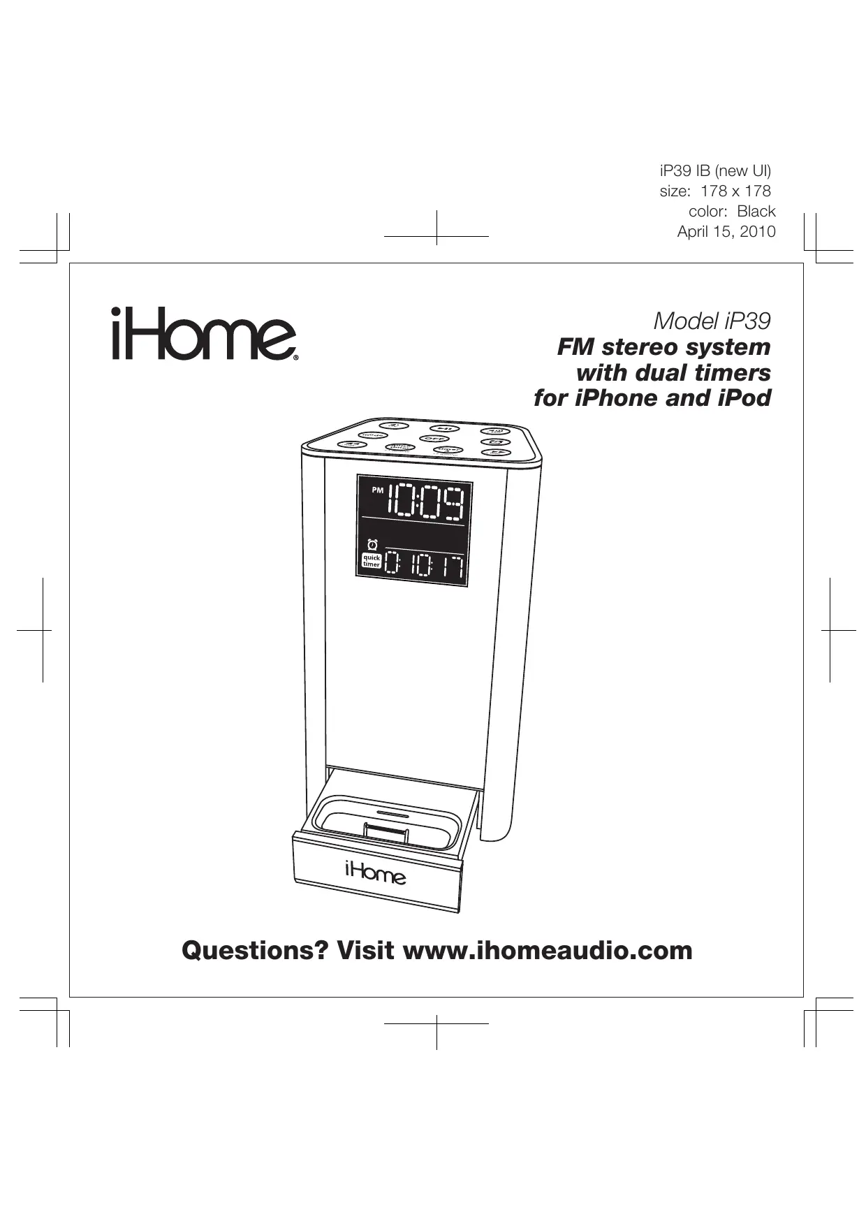 iP39 1B (new Ul) size: 178 x 178 color: Black April 15, 2010 Model! iP39 , FM stereo system with dual timers for iPhone and iPod Questions? Visit www.ihomeaudio.com