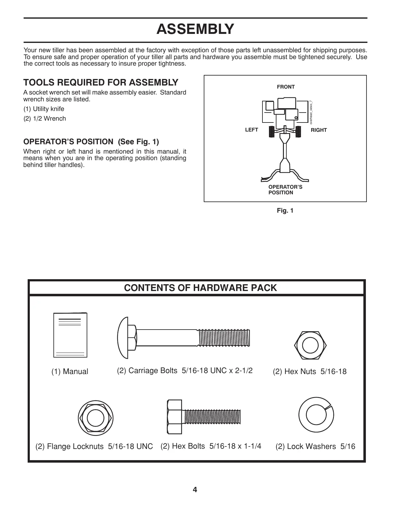 Your new tiller has been assembled at the factory with exception of those parts left unassembled for shipping purposes. To ensure safe and proper operation of your tiller all parts and hardware you assemble must be tightened securely. Use the correct tools as necessary to insure proper tightness.