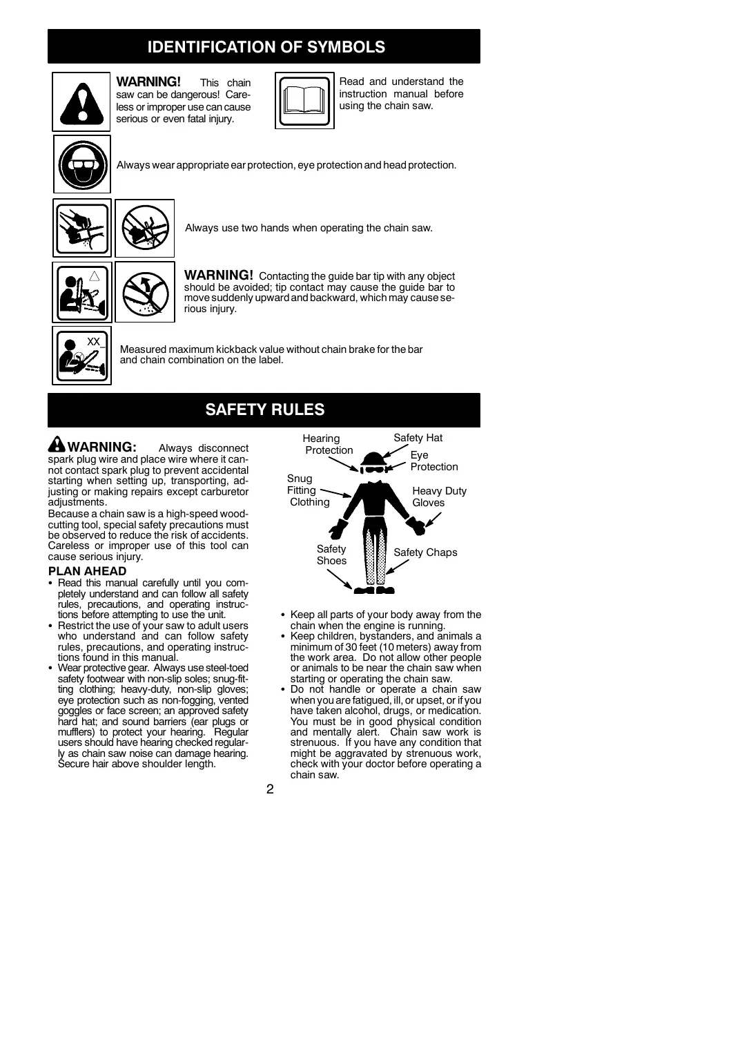 rious injury. Read and understand the instruction manual before using the chain saw. © Always wear appropriate ear protection, eye protection and head protection. Always use two hands when operating the chain saw. WARNING! Contacting the guide bar tip with any object should be avoided; tip contact may cause the guide bar to move suddenly upward and backward, which may cause se- Measured maximum kickback value without chain brake for the bar and chain combination on the label. SAFETY RULES A WARNING: Aways disconnect Spark plug wire and place wire where it can- not contact spark plug to prevent accidental starting when setting up, transporting, ad- justing or making repairs except carburetor adjustments. Because a chain saw is a high-speed wood- cutting tool, special safety precautions must be observed to reduce the risk of accidents. Careless or improper use of this tool can cause Sérous injury PLAN AHEAD + Read this manual carefully until you com- pletely understand and can follow all safety rules, precautions, and operating instruc- tions before attempting to use the unit. + Restrictthe use of your saw to adult users who understand and can follow safety rules, precautions, and operating instruc- tions found in this manual. + Wear protective gear. Always use steel-toed safety footwear with non-slip soles; snug-ft- ing Clothing; heavy-duty, non-slip gloves: eye protection such as non-fogging, vented goggles or face screen, an approved safety hard hat, and sound bariers (ear plugs or mufñlers) to protect your hearing._ Regular users should have hearing checked regular- 28 chain saw noise can damage hearing. ecure hair above shoulder length. Hearing Safety Hat Protection Eye tes Protection Snug Fiting —. Heavy Duty Clothing Gloves Safety Safety Chaps Shoes