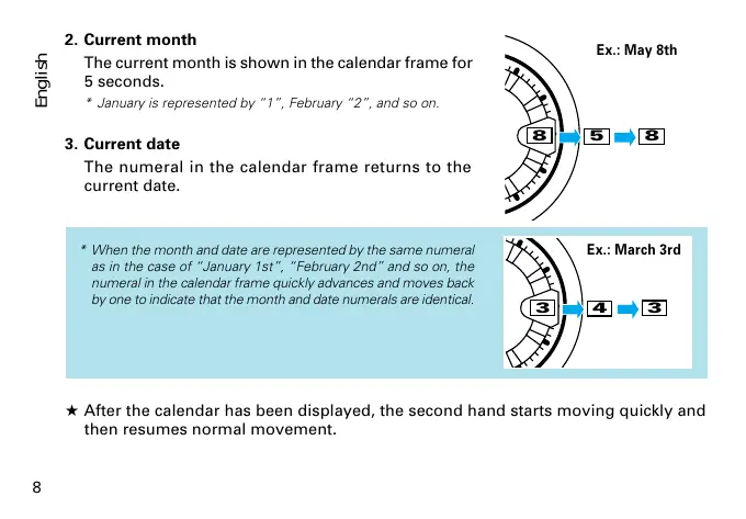 - After the calendar has been displayed, the second hand starts moving quickly and then resumes normal movement.
