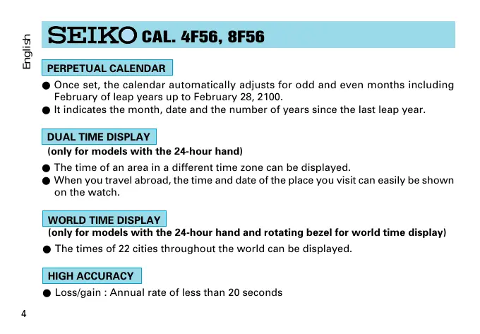 - Monthly rate of loss/gain may amount to épproximately 4 seconds depending on the condition of use. 10°C - 60°C (14°F - 140F) Step motor for the time indication: Ükrasonie motor for the calendar indication Hour, minute, second and 24-hour hands: {Some models do not have a 24-hour hand) Displayed in numerals. SEIKO CR1612, 1 piece (Cal. 4F56) SEIKO CR2412, 1 piece (Cal. 8F56) C-MOS-LSI, 1 piece 4,800 A/m (60 gauss)