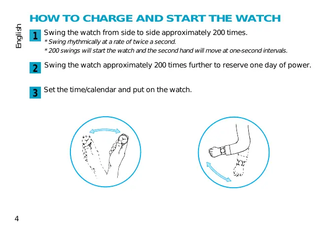HOW TO CHARGE AND START THE WATCH M Swing the watch from side to side approximately 200 times. Ë + Swing rhythmically at a rate of twice a second. *200 swings will start the watch and the second hand will move at one-second intervals. MBA Swing the watch approximately 200 times further to reserve one day of power. A S<tre timecalendar and put on the watch.