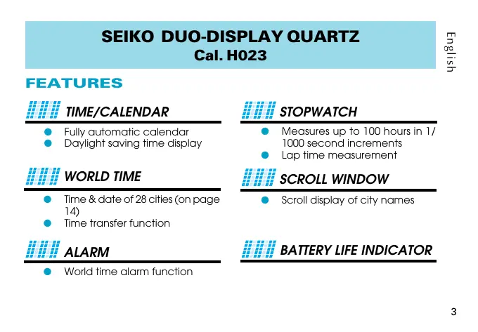 FEATURES TIME/CALENDAR FE STOPWATCH © Fuly automatic calendar © Daylight saving time display ff WORLD TIME © Measures up to 100 hours in 1/ 1000 second increments © _Lap time measurement ### scrou wiDow © _ me & date of 28 cities (on page 14) © Time transferfunction ALARM © Scroll display of city names